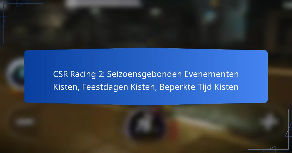 Seizoensgebonden evenementenkisten in CSR Racing 2 bieden spelers unieke beloningen en items voor beperkte tijd die de gameplay verbeteren. Deze kisten zijn beschikbaar tijdens specifieke evenementen en hebben exclusieve thema’s, waardoor ze een waardevolle aanvulling zijn voor spelers die hun in-game bezittingen willen maximaliseren.